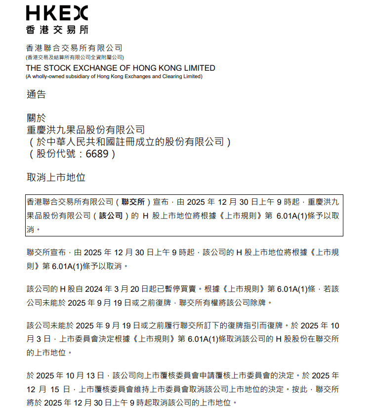 近日,联交所颁布发表,沉庆洪九果品股份无限公司的H股上市地位将于12月30日上午9时起予以打消。