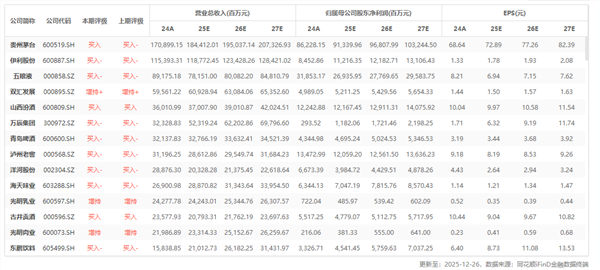 证券之星食物饮料行业周报:2025年12月22日-2025年12月26日,沪深300指数1。95%,申万食物饮料指数下跌0。7%。前五大上涨个股别离为:安记食物、日辰股份、红棉股份、西麦食物。成长为从线、注沉供需出清下的拐点机遇。1)白酒保举成长及先出清标的:山西汾酒、古井贡酒、送驾贡酒、当代缘、珍酒李渡、舍得酒业、金徽酒以及稳健标的:贵州茅台、五粮液、泸州老窖;2)饮料布局性高增,保举东鹏饮料、农夫山泉(港股),注沉低估值高股息,保举中国食物(港股)、康师傅控股(港股)、同一企业中国(港股)、中国旺旺(港股);3)零食及食物原料成长标的:保举百龙创园、盐津铺子、卫龙甘旨(港股)、三只松鼠、西麦食物;4)啤酒保举燕京啤酒、青岛啤酒、珠江啤酒、百润股份,华润啤酒(港股);5)调味品平稳、牧业产能去化,餐供无望恢复,保举千禾味业、宝立食物、巴比食物、安井食物、海天味业、安琪酵母、伊利股份、新乳业、优然牧业(港股)、现代牧业(港股)。本次反补助办法给相关产物的市场留出了空间,我们估计市场供给缺口将由国内龙头奶酪奶油企业及海外巨头如恒天然、OCD 衔接,次要利好立高食物、海融科技、南侨食物,妙可蓝多等企业。蒙牛乳业、伊利股份也正在沉点打制乳成品深加工产物,持久来看亦将受益。商务部:自明日起 采纳姑且反补助税金的形式对原产于欧盟的进口相关乳成品实施姑且反补助办法据财联社,12月22日,商务部通知布告,查询拜访机关初步认定,原产于欧盟的进口相关乳成品存正在补助,中国国内相关乳成品财产遭到本色损害,并且补助取本色损害之间存正在关系。国务院关税税则委员会按照商务部的做出决定,自2025年12月23日起,采纳姑且反补助税金的形式对原产于欧盟的进口相关乳成品实施姑且反补助办法。进口运营者正在进口被查询拜访产物时,应根据本初裁决定所确定的各公司的从价补助率向中华人平易近国海关供给响应的姑且反补助税金。据财联社,国度卫生健康委召开旧事发布会,引见新版《食物平安国度尺度 预包拆食物养分标签公例》相关环境。国度卫生健康委提示:关心养分成分表中的脂肪、饱和脂肪、钠和糖含量,是节制“”健康风险的第一步。新版《食物平安国度尺度 预包拆食物养分标签公例》将“饱和脂肪(或饱和脂肪酸)”和“糖”新列入必需标示的焦点项目。该尺度将从2027年3月16日起正式实施,激励企业可正在此日期前提前实施。据财联社,12月22日电,上海市经济和消息化委员会等多部分印发《上海市加速食物科技立异赋能财产成长步履方案(20262030年)》,到2027年,实现合成生物食物创制主要冲破,提拔食物数智化制制程度。研制并获批35种新食物原料、食物添加剂新品种、食物相关产物新品种(以下简称“三新食物”),开辟12个特殊医学用处配方食物;引育5家以上具有食物创制焦点手艺取数智化制制能力的自从立异企业;成立健全食物财产成长的尺度系统,构成研、检、审联动的协同机制。据每日经济网,2025年,白酒行业掀起“开瓶率”提拔活动。面临高库存、渠道资金收缩压力,泸州老窖、习酒等酒企将开瓶率纳入焦点查核,通过“扫码领红包”“宴席场景渗入”等策略打通消费“最初一公里”。数据显示,皇沟酒业宴席开瓶率增加超230%,五粮液宴席开瓶率增20%。专家指出,开瓶率是权衡实正在动销的“温度计”,但行业需同步推进控量保价、消费者培育,避免渠道数据,实现可持续增加。据新京报,本年下半年,五粮液、汾酒等名酒企业推出20多度白酒,掀起低趋向会商。2020-2024年,低度白酒市场规模从200亿元增至570亿元,估计2025年持续增加,90后、95后成主要消吃力量。低度白酒虽送市场机缘,但面对手艺挑和:浓喷鼻型降度手艺成熟,酱喷鼻型因风味协调、不变性问题动做保守,如茅台仅保留43度产物。业内专家指出,低需冲破“低而不淡”手艺瓶颈,同时需均衡价钱取年轻消费群体接管度。低度白酒成长既是行业转型契机,也需积弊实现高质量成长。12月24日,据泸州白酒价钱指数办公室动静, 全国白酒价钱查询拜访材料显示,12月中旬全国白酒环比价钱总指数为99。73,下跌0。27%。从分类指数看,名酒环比价钱指数为99。50,下跌0。50%;处所酒环比价钱指数为99。87,下跌0。13%;基酒环比价钱指数为100。19,上涨0。19%。从定基价钱指数看,12月中旬全国白酒商品批发价钱定基总指数为107。07,上涨7。07%。此中,名酒定基价钱指数为108。30,上涨8。30%;处所酒定基价钱指数为103。23,上涨3。23%;基酒定基价钱指数为110。13,上涨10。13%。据第一财经,12月24日,正在安静数日后,茅台价钱再次发生较大波动。第三方平台显示,今天(24日)多个茅台品种的价钱大涨,此中最为夸张的是蛇年茅台,一日暴涨230元/瓶,让酒商惊呼“黄牛疯了”。多位受访酒商暗示,目前市场需求并未发生变化,驱动市场价钱波动的更多是心理要素。记者领会到,从23日晚,多款茅台价钱就起头跌价,按照第三方平台显示,25年茅台原箱价钱一日上涨了40元/瓶,从头回到1600元/瓶,散花和笙乐也别离有100元/瓶和170元/瓶的涨幅,收复了近期部门跌幅。但价钱涨幅最为夸张的仍是蛇年茅台,今日批发价钱从1770元上升至2000元/瓶。据,市场监管总局25日回应,“南极磷虾油”事务出企业委托出产加工行为不规范等问题。一些企业借帮企业品牌影响力,仅关登记售利润却不合错误